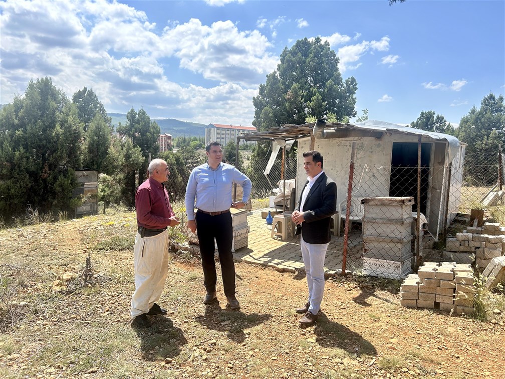 Bozkır Kaymakamı Tolga Turan ve Bozkır Tarım ve Orman Müdürü Halil Durmuş ile birlikte ilçe merkezinde bulunan arılıkları ziyaret ederek ilçedeki arıcılık faaliyetleri hakkında bilgi aldı.